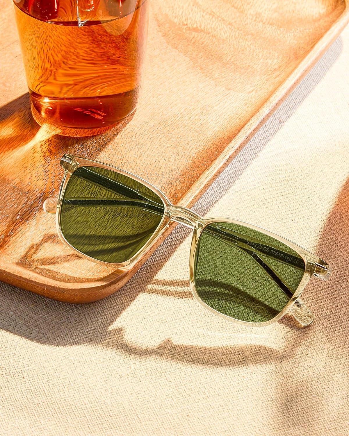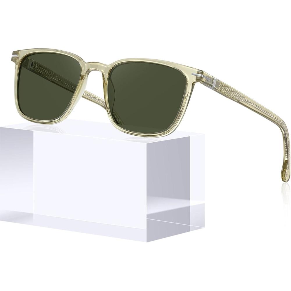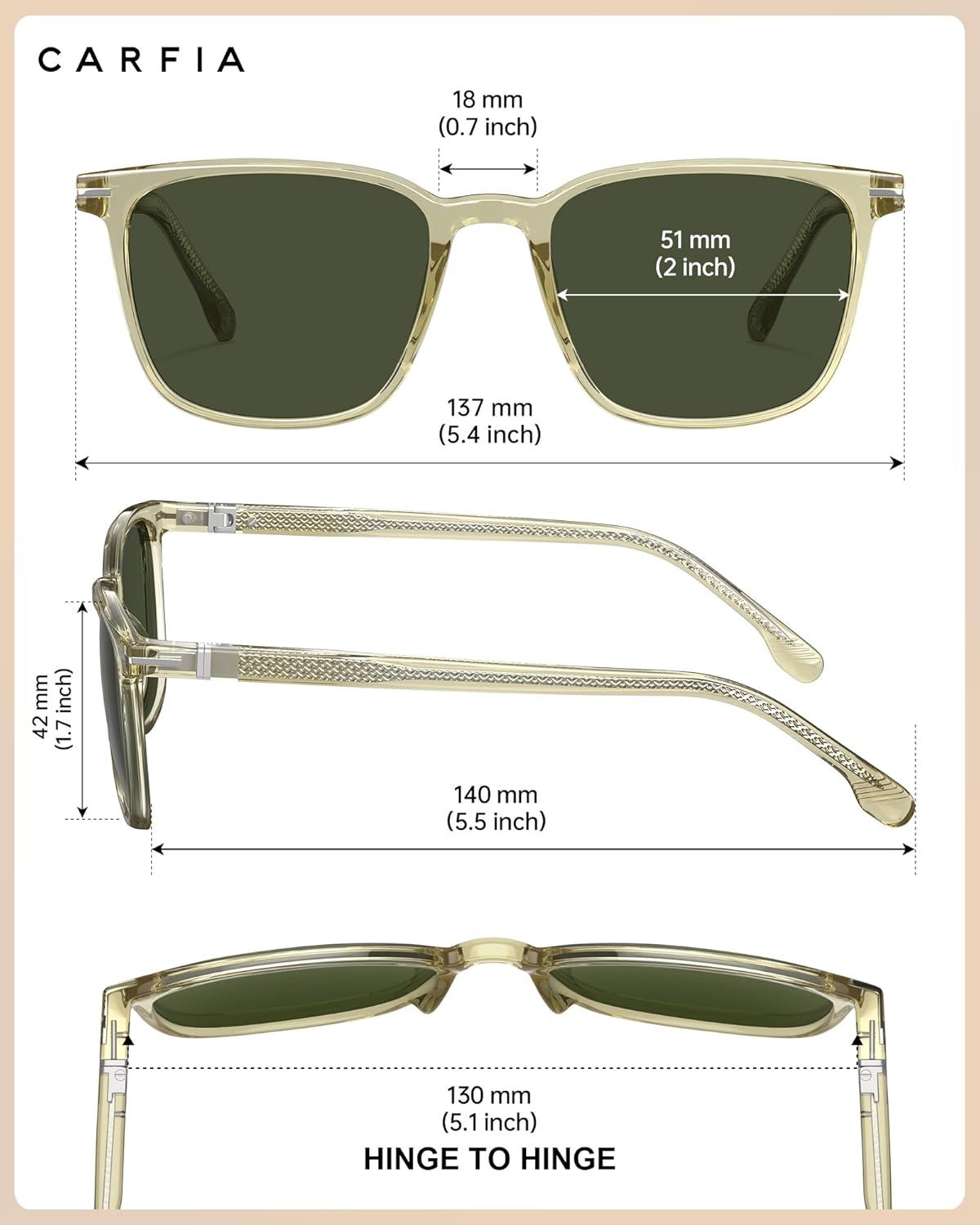 CARFIA Classic Polarized Sunglasses for Men UV400 Protection, Flexible Acetate Shades with Core Wire Design CA31238(D. Clear Tea Frame Green Lenses)