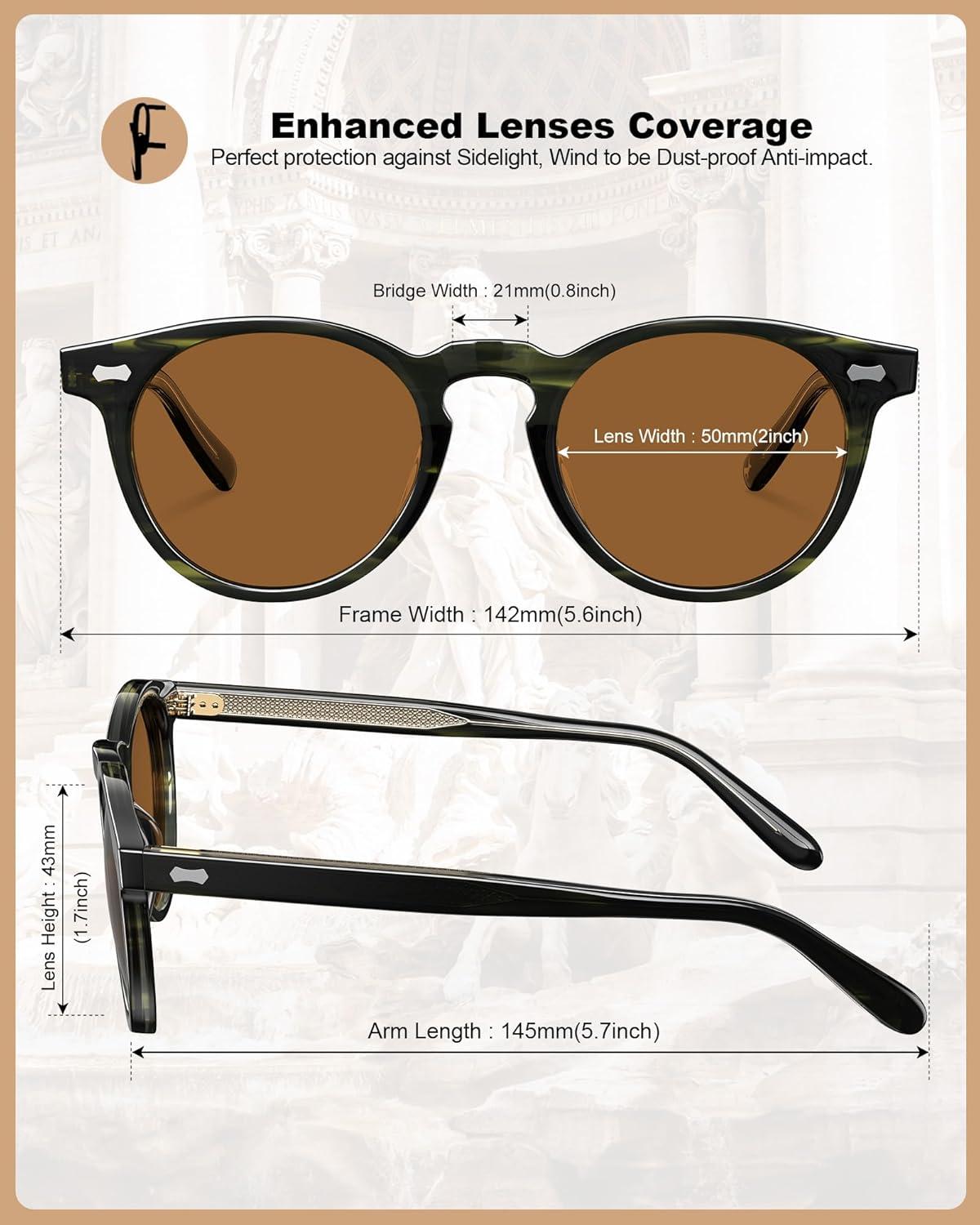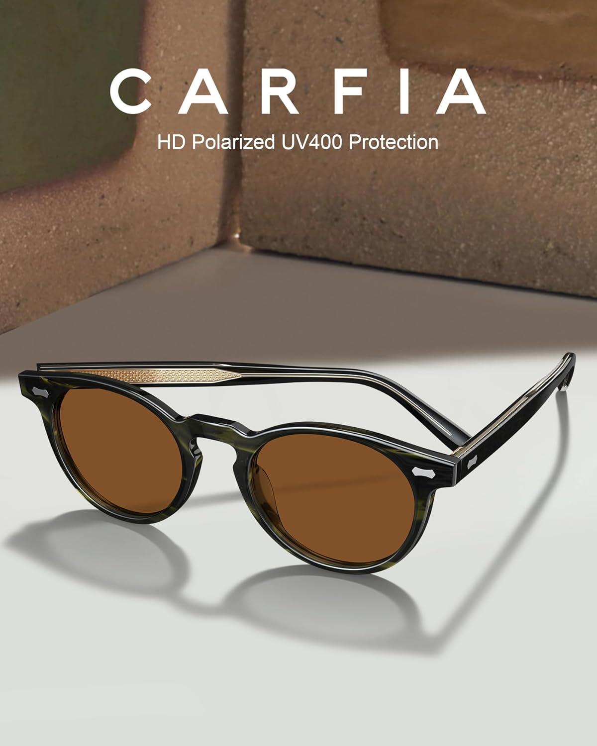 imageCARFIA Retro Acetate Polarized Sunglasses for Men UV Protection Vintage Round Frame Eyewear with Gold Filigree CA5506F Green Black Swirled Frame Brown Lens