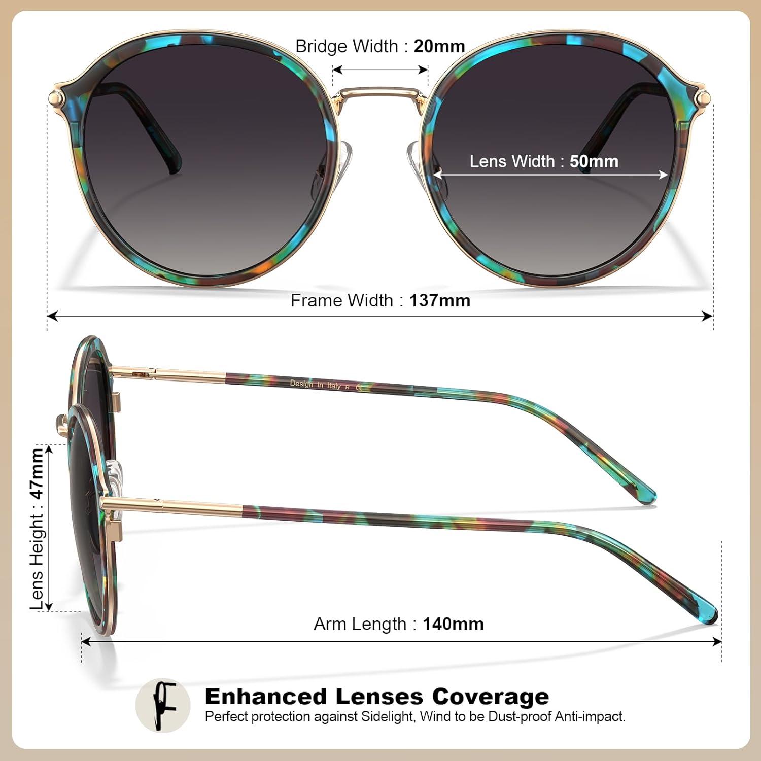 CARFIA Retro Acetate Polarized Sunglasses for Women UV Protection, Fashion Metal Brow Ladies Shades Eyewears Round Sunnies(2. Blue Floral Frame and Grey Lens)