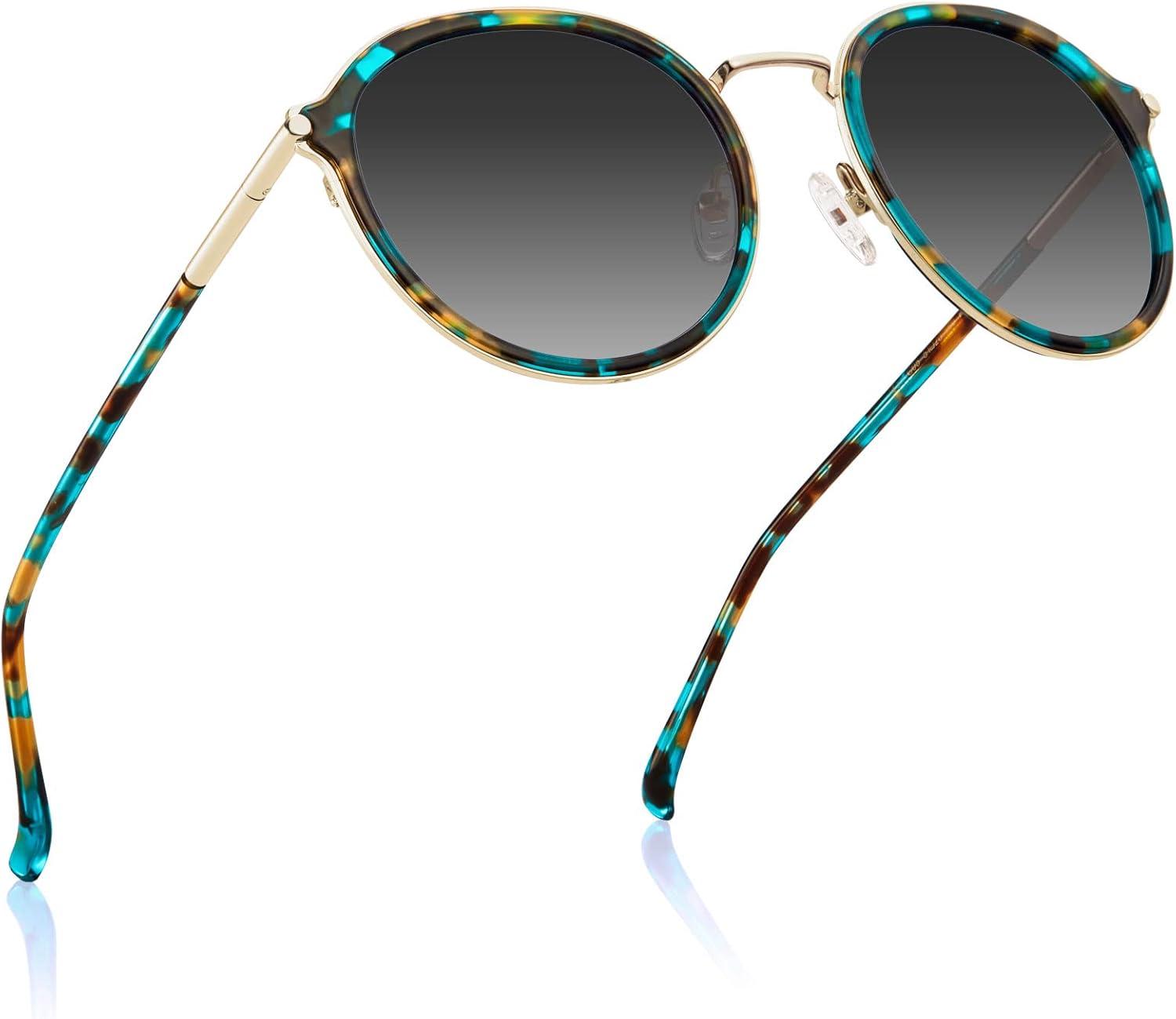 CARFIA Retro Acetate Polarized Sunglasses for Women UV Protection, Fashion Metal Brow Ladies Shades Eyewears Round Sunnies(1. Black Frame and Grey Lens)