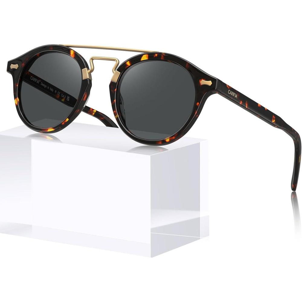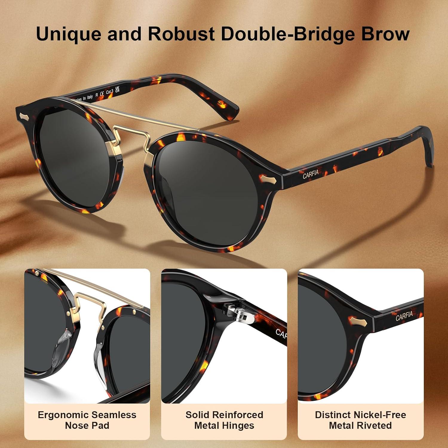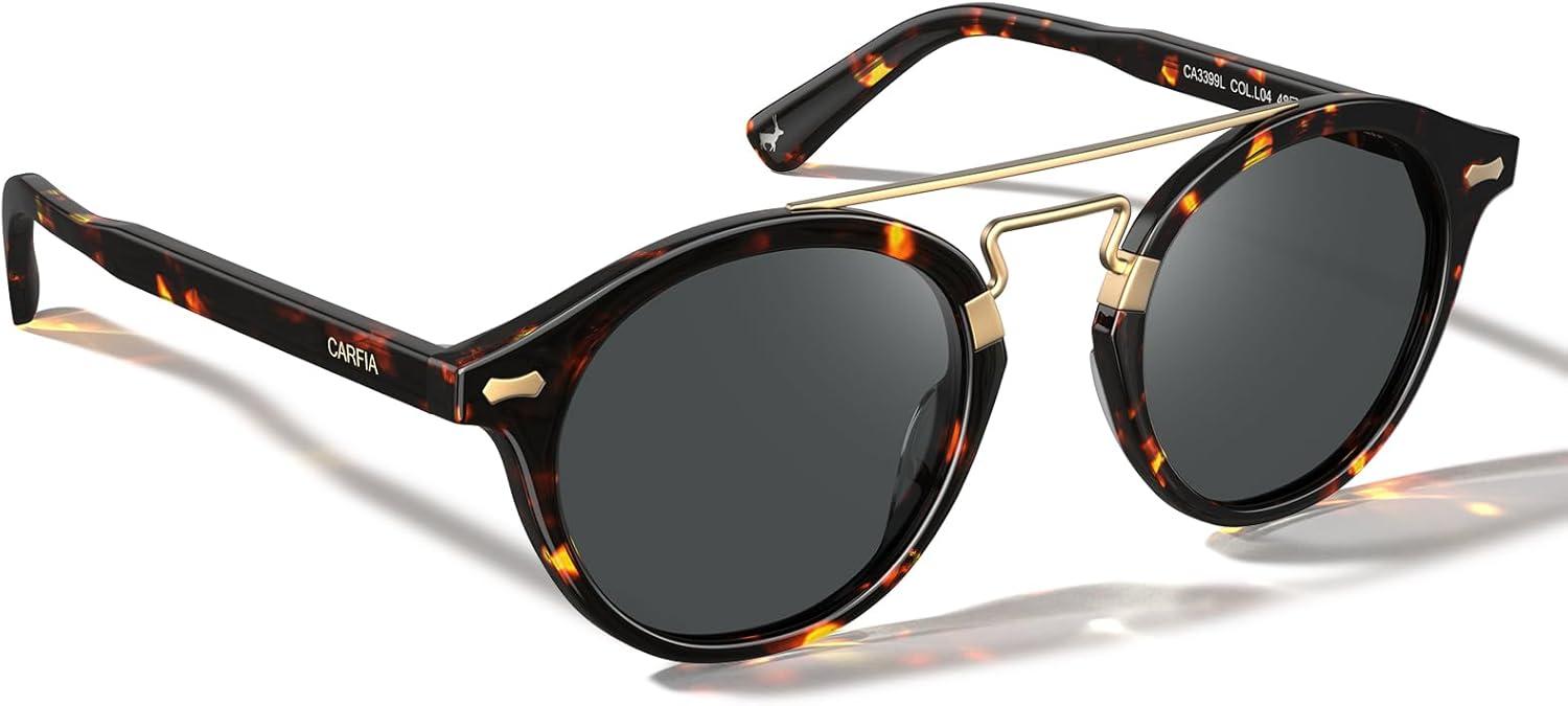 CARFIA Retro Acetate Small Face Polarized Sunglasses for Men Women Trendy Metal Double Bridge Round Sun Glasses CA3399L(2. Tortoise Frame Gray Lenses)