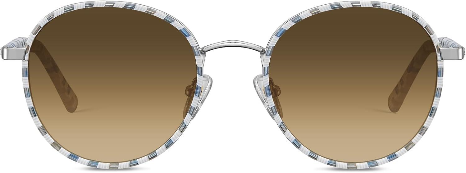 CARFIA Retro Round Polarized Sunglasses for Women UV Protection Acetate Arms Metal Frame Driving Glasses(Checkered Frame / Brown Gradient Lens)